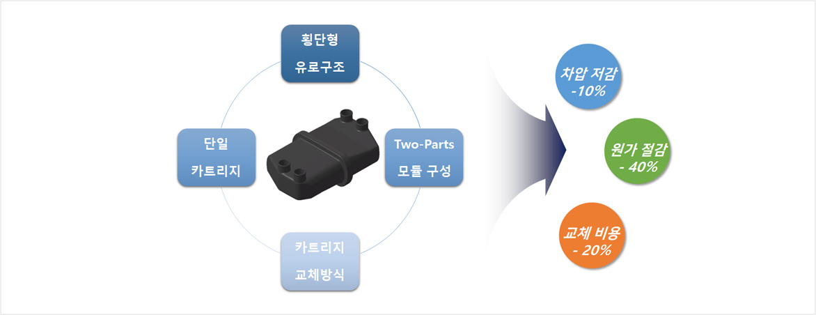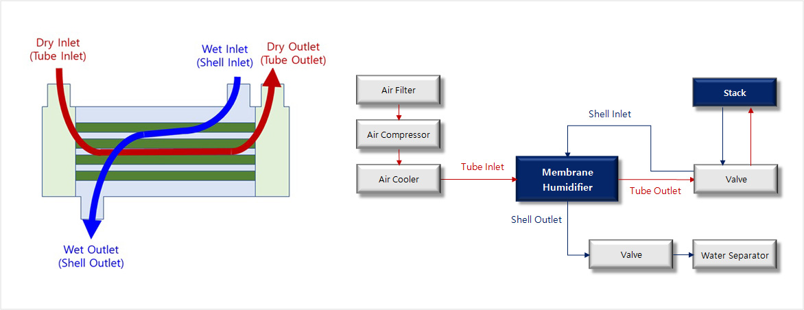 자체 개발한 막가습기는 횡단형 유로구조를 적용하여 차압저감이 가능하고 단일 카트리지와 모듈 부품 수량을 줄여서 원가절감을 실현하였습니다.