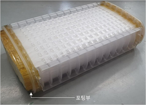 전자 산업에서, 포팅(potting)은 충격 및 진동에 대한 내성과 습기 및 부식 방지를 위해 전자 부품 전체에 단단하거나 젤라틴과 같이 신축성이 있는 컴파운드를 채우는 공정임 멤브레인 산업에서는 다수의 멤브레인에 도포하여 몸체에 고정시키고 외부 기밀을 유지하는 역할을 하여 필터를 제조하는 공정입니다.